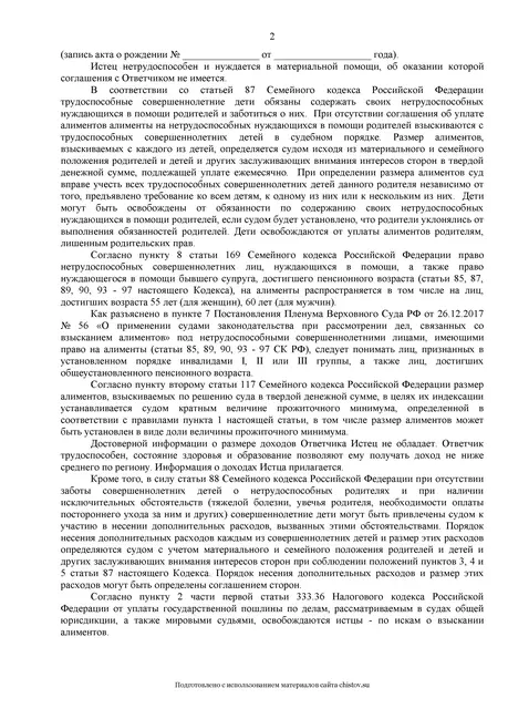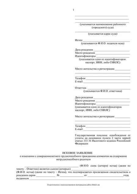 На настоящем сайте Вы можете бесплатно и без регистрации скачать онлайн примерный образец искового заявления иска (шаблон для заполнения от руки) о взыскании алиментов с сына (дочери) в пользу родителя (отца или матери) в форматах Word и PDF, заполнить образец от руки и подать его в суд самостоятельно.