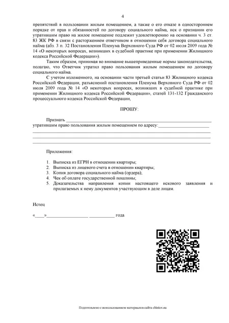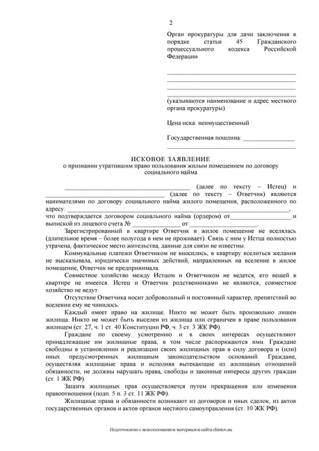 На настоящем сайте Вы можете бесплатно и без регистрации скачать онлайн примерный образец искового заявления о признании утратившим право пользования квартирой по договору социального найма в форматах Word и PDF, заполнить образец от руки и подать его в суд самостоятельно.
