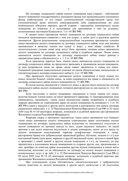 Рассматривая споры о признании нанимателя, члена семьи нанимателя или бывшего члена семьи нанимателя жилого помещения утратившими право пользования жилым помещением по договору социального найма вследствие их постоянного отсутствия в жилом помещении по причине выезда из него, судам надлежит выяснять: по какой причине и как долго ответчик отсутствует в жилом помещении, носит ли его выезд из жилого помещения вынужденный характер (конфликтные отношения в семье, расторжение брака) или добровольный, временный (работа, обучение, лечение и т.п.) или постоянный (вывез свои вещи, переехал в другой населенный пункт, вступил в новый брак и проживает с новой семьей в другом жилом помещении и т.п.), не чинились ли ему препятствия в пользовании жилым помещением со стороны других лиц, проживающих в нем, приобрел ли ответчик право пользования другим жилым помещением в новом месте жительства, исполняет ли он обязанности по договору по оплате жилого помещения и коммунальных услуг и др.