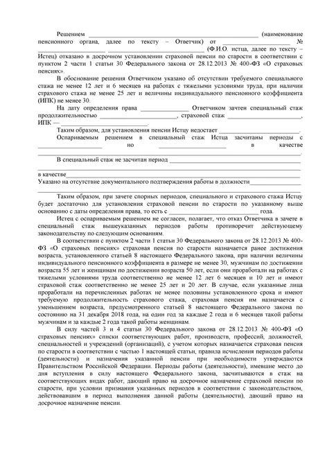 Решением _____________________________________________________ (наименование пенсионного органа, далее по тексту – Ответчик) от _____________________ № _____________________ ______________________________ (Ф.И.О. истца, далее по тексту – Истец) отказано в досрочном установлении страховой пенсии по старости в соответствии с пунктом 2 части 1 статьи 30 Федерального закона от 28.12.2013 № 400-ФЗ «О страховых пенсиях».