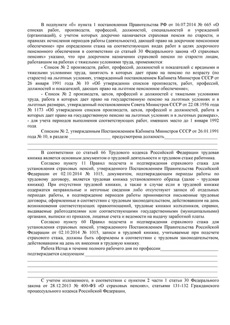 Оспариваемым решением в специальный стаж Истца засчитаны периоды с ____________________ но _____________________ в качестве __________________________________________________________________________________.