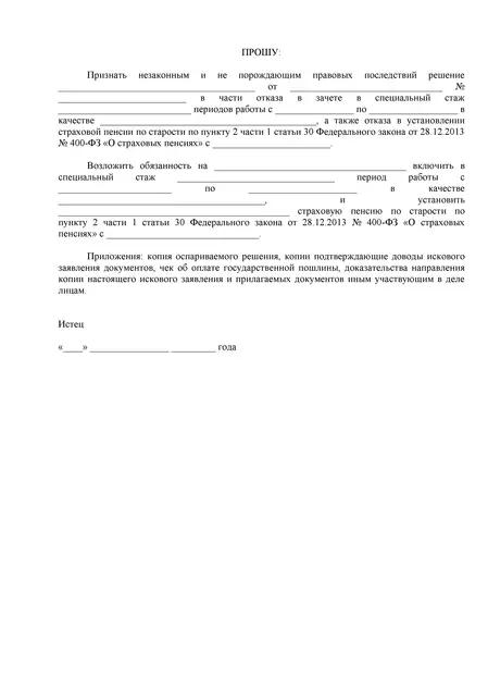 Признать незаконным и не порождающим правовых последствий решение ________________________________________ от _______________________________ № __________________________ в части отказа в зачете в специальный стаж ___________________________ периодов работы с ________________ по __________________ в качестве ____________________________________________, а также отказа в установлении страховой пенсии по старости по пункту 2 части 1 статьи 30 Федерального закона от 28.12.2013 № 400-ФЗ «О страховых пенсиях» с ________________________.