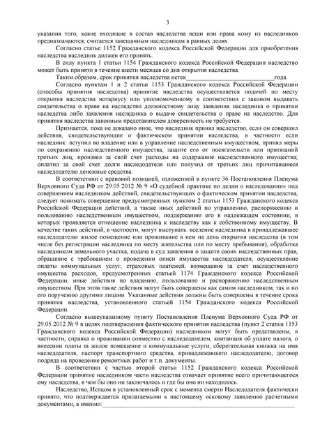 Согласно п. 34, п. 8 Постановления Пленума Верховного суда РФ от «ИЗЪЯТО» № «О судебной практике по делам о наследовании», наследник, принявший наследство, независимо от времени и способа его принятия считается собственником наследственного имущества, носителем имущественных прав и обязанностей со дня открытия наследства вне зависимости от факта государственной регистрации прав на наследственное имущество и ее момента (если такая регистрация предусмотрена законом); при отсутствии надлежаще оформленных документов, подтверждающих право собственности наследодателя на имущество, судами до истечения срока принятия наследства (статья 1154 ГК РФ) рассматриваются требования наследников о включении этого имущества в состав наследства, а если в указанный срок решение не было вынесено, - также требования о признании права собственности в порядке наследования.