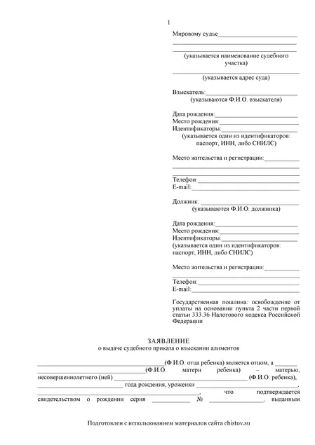 Примерный образец заполнения заявления мировому судье о выдаче судебного приказа о взыскании алиментов на одного ребенка.