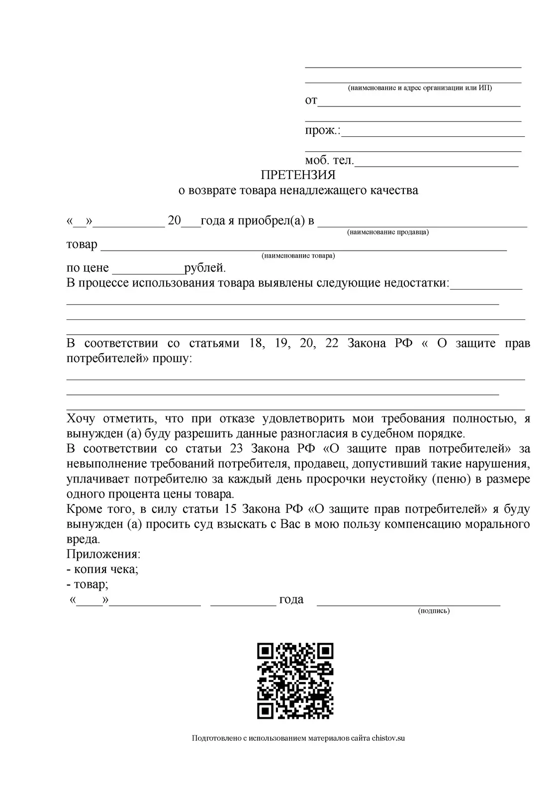 Скачать бесплатный образец (шаблон, бланк для заполнения руки) претензии (заявления) продавцу о возврате денег за бракованный товар с недостатками.