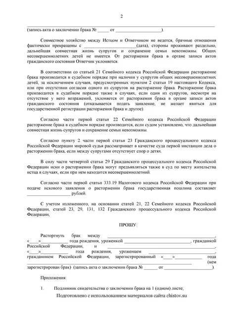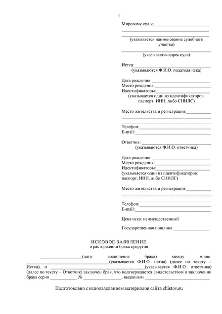 На настоящем сайте Вы можете бесплатно и без регистрации скачать онлайн примерный шаблон иска о разводе супругов без детей от имени любого из супругов в форматах Word и PDF, заполнить образец от руки и подать его в суд самостоятельно.