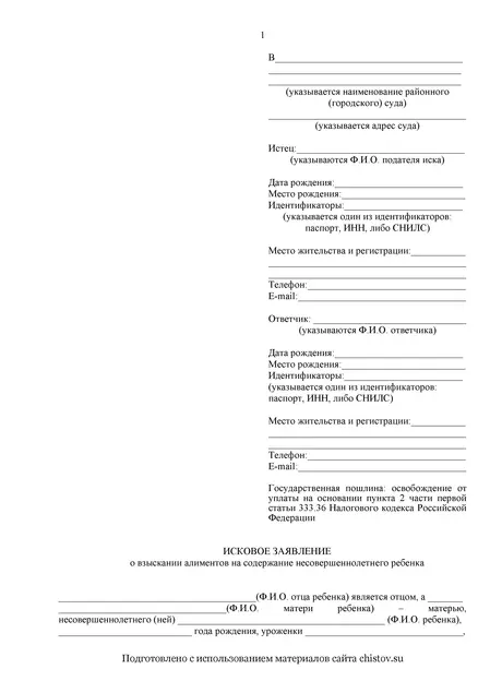 Данное заявление государственной пошлиной также не облагается и может подаваться как по месту жительства матери, так и отца ребенка.
