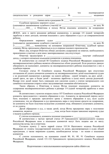 Судебным приказом мирового судьи ____________________________________________ (указывается наименование судебного участка) от ____________________________ по делу № 2-__________/202___ с Ответчика в пользу Истца взысканы алименты на содержание __________________________________________________________________________________