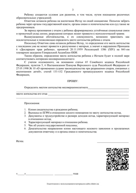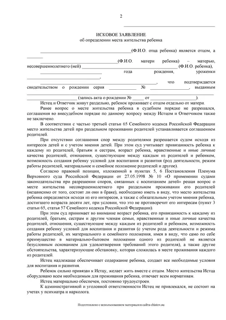 Образец искового заявления в суд об определении места жительства ребенка вместе с отцом.