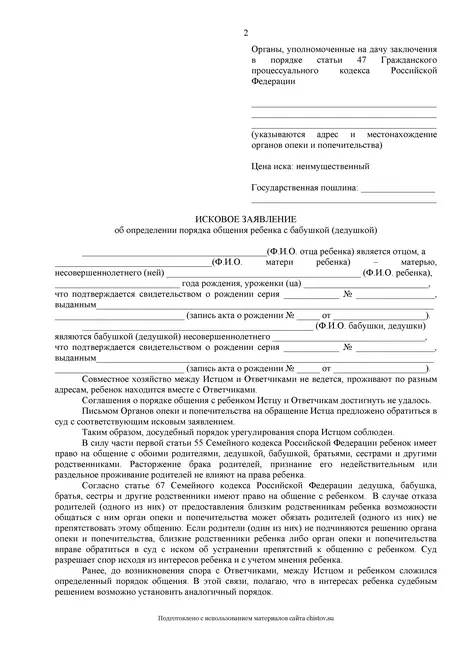 На настоящем сайте Вы можете бесплатно и без регистрации скачать онлайн примерный образец искового заявления о порядке общения бабушки или дедушки с внуками или внучками в форматах Word и PDF, заполнить образец от руки и подать его в суд самостоятельно.