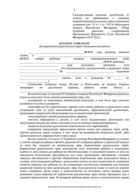 На настоящем сайте Вы можете бесплатно и без регистрации скачать онлайн примерный образец искового заявления об ограничении в родительских правах в форматах Word и PDF, заполнить образец от руки и подать его в суд самостоятельно.