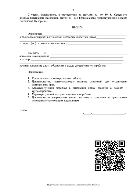 Образец искового заявления в суд об ограничении отца или матери ребенка родительских прав.