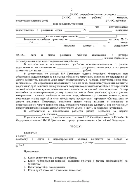 Образец искового заявления о взыскании неустойки с неплательщика алиментов за просрочку.