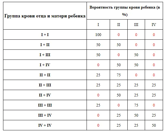 Таблица групп крови отца и матери ребенка для определения примерной вероятности отцовства.