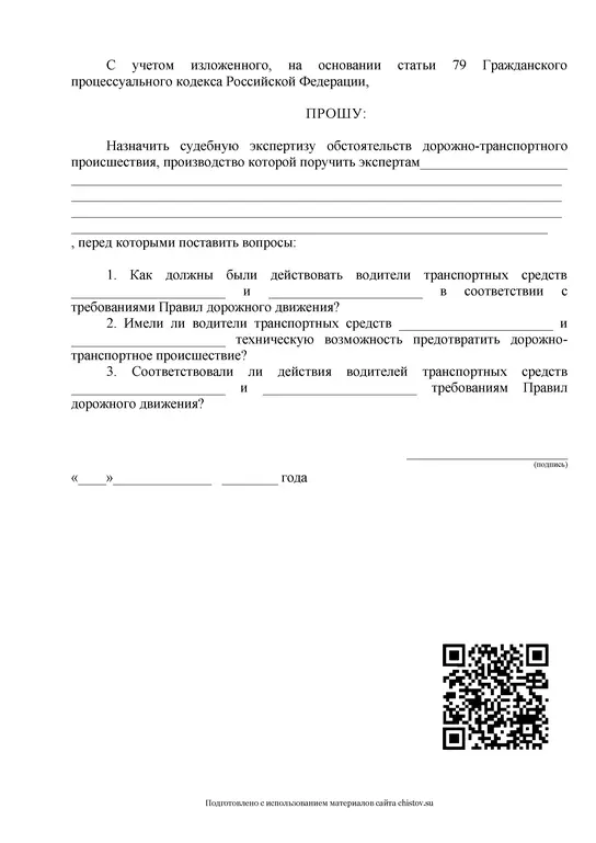 Образец ходатайства в суд о назначении экспертизы для определения виновности в дорожно-транспортном происшествии.