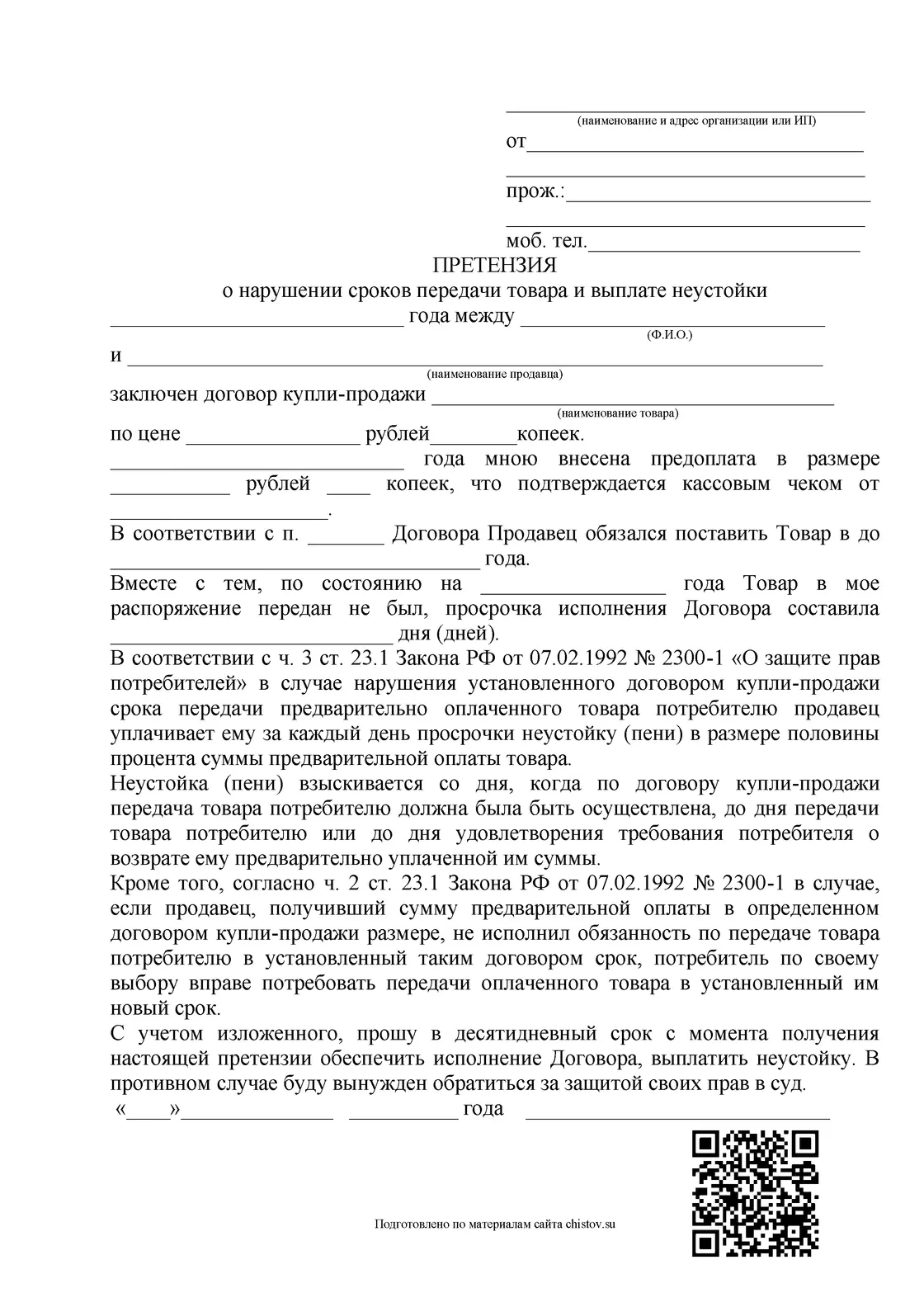 Что делать, если товар выдан продавцом с нарушением установленного договором срока, либо вообще не выдан и просрочка составляет уже как минимум несколько дней? Какую ответственность несет продавец, как правильно составить и вручить претензию?